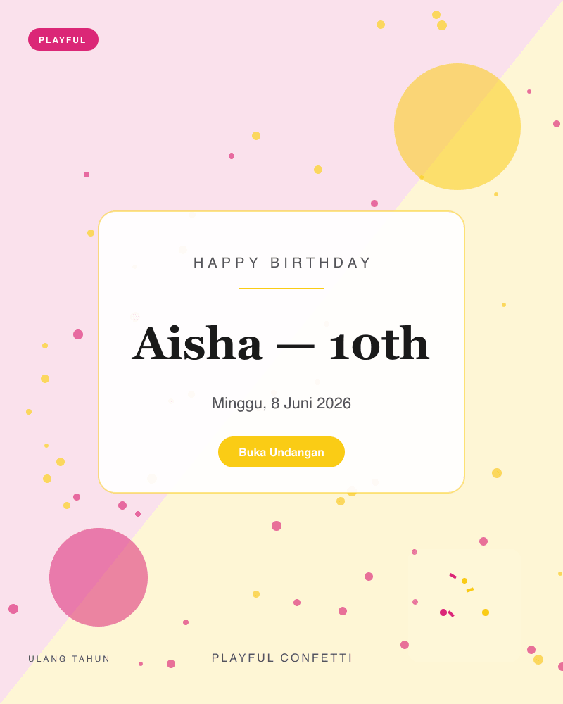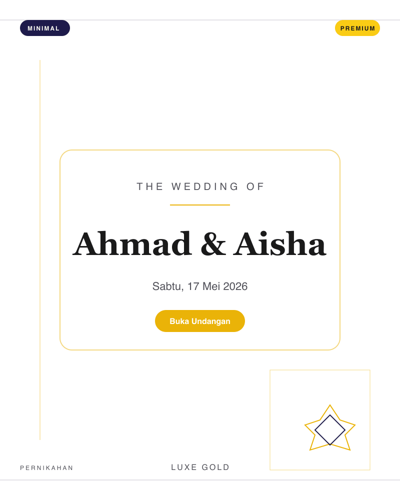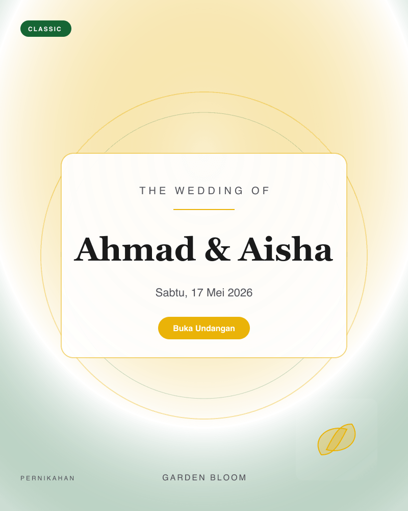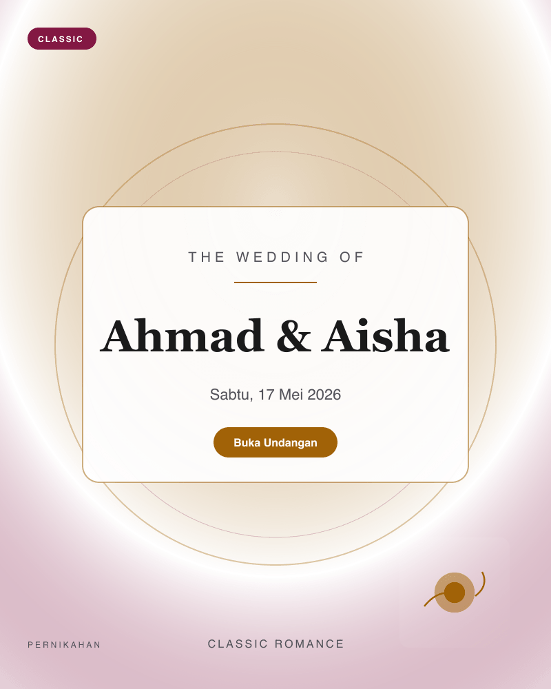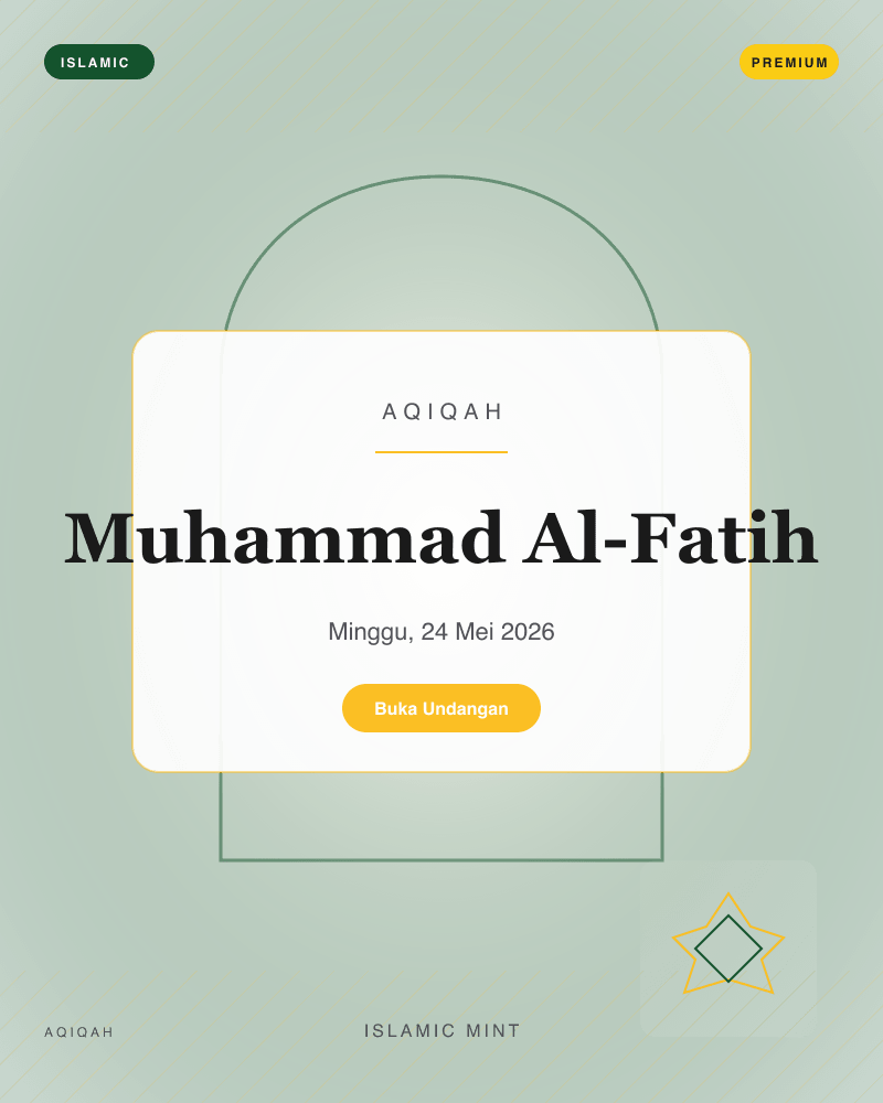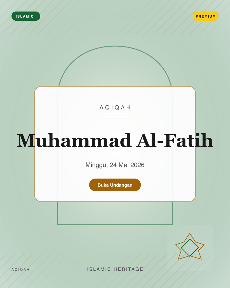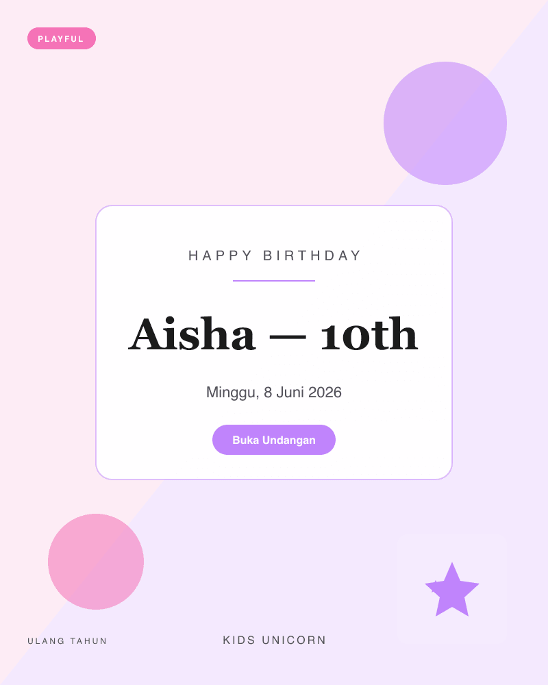 18 template siap pakai — dari klasik, playful, Islamic, minimal, royal, hingga retro. Preview langsung sebelum memilih.